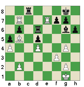 با برتری كامل. سياه قصد دارد رخها را در ستون d دوبله كرده و از طريق خانه d2 به مواضع سفيد رخنه كند.